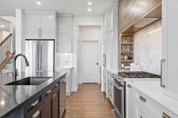 Welcome to this exceptional 30 ft wide former showhome, backing directly onto the scenic Bayview Park, in a vibrant community featuring a tranquil canal system, expansive green spaces, and a future school just steps away. Thoughtfully designed and meticulously upgraded with over $150,000 in high-end finishes, this award-winning residence blends sophistication, comfort, and modern functionality.Over 3600 Sq ft. developed area, the main level impresses with two-tone cabinetry, stacked flooring, and two-tone quartz countertops, beautifully accented by white oak railings and elegant boxed-up ceiling details. The custom kitchen is both stylish and practical, seamlessly connecting to open-concept living and dining areas. A large spa-inspired ensuite bathroom and comfort-height vanities bring a touch of everyday luxury, while triple-pane windows ensure quiet and energy efficiency throughout the home.Upstairs, a generous bonus room with 9 ft ceilings offers a perfect space for relaxing or entertaining. Every bedroom is pre-wired with TV and data ports, reflecting the home’s forward-thinking design. The laundry room is roughed in for a future sink, offering additional convenience.The fully developed basement adds an additional 810 sq ft of living space with 9 ft ceilings, and features a spacious recreational area, a large bedroom, and a full bathroom, perfect for guests, teens, or multi-generational living. In-ceiling speakers are installed on every level, delivering a seamless audio experience throughout the home.Modern amenities continue with a dual-zone furnace system, central air conditioning, and an upgraded 200 AMP electrical panel. The heated garage with an 8 ft overhead door is EV-ready with charging rough-in already in place. Exterior upgrades include Gemstone permanent lighting, an irrigation system, and a hot tub control panel, enhancing the outdoor lifestyle.This is a rare opportunity to own a turnkey luxury home in a premier location—designed to impress and built to last.