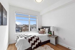 Discover modern living at its finest 3 Bedroom, 2.5 Bathroom Tribecca townhome, complete with a versatile flex room and a rare double-car garage. Thoughtfully designed for comfort, functionality, and elevated style, this home offers generous living spaces and refined finishes throughout.Step inside to a bright first-floor flex room—perfect for a home office, gym, or hobby space. The main level boasts 10' ceilings, an inviting open-concept kitchen, and a stylish stained feature wall that adds warmth and sophistication. The chef-inspired kitchen is equipped with Samsung stainless steel appliances, including a French-door fridge with built-in water, sleek quartz countertops, full-height ceramic tile backsplashes, and tall upper cabinets with under-cabinet valance lighting. A large island anchors the space, ideal for gatherings and everyday living.Enjoy seamless indoor–outdoor living with two private balconies—one off the main floor living area and another in the secondary bedroom. The upper level features 9' ceilings, three well-appointed bedrooms, and spa-inspired bathrooms complete with full-height ceramic tile shower/tub surrounds. Automated zebra blinds throughout add modern convenience, while luxury vinyl plank flooring enhances durability and style.Additional highlights include:Main floor den for added flexibilityVinyl decking with aluminum rail and glass panelsDouble attached garage providing secure parking and storageFully landscaped surroundings for a polished exterior presenceUnbeatable Location: Just steps from Costco, Walmart, Cineplex, major banks, restaurants, and all the everyday essentials. Enjoy quick access to major routes—3 minutes to Stoney Trail, 4 minutes to Highway 1, and only 15 minutes to Downtown Calgary. You're also just 7 minutes from Gurdwara Sahib and a 1-minute walk to a nearby park and future school site.This home truly offers modern living in a vibrant new community with unmatched convenience and style. Whether you're a first-time buyer, investor, or searching for your next family home, this is an opportunity you don’t want to miss! Book your private showing today and experience everything this home has to offer.