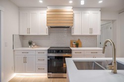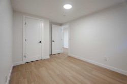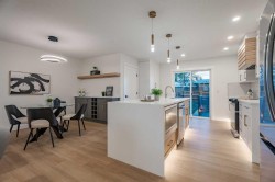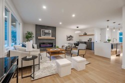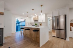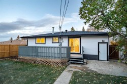 | LEGAL BASEMENT SUITE | SEPARATE LAUNDRY & ENTRY | EXTENSIVELY RENOVATED | OVERSIZED GARAGE | RV PARKING | If a home could make an impression, this one surely would. Welcome to this fully reimagined bungalow in Huntington Hills, where every detail has been thoughtfully updated and nothing left untouched. Featuring a NEW roof, siding, furnace, water tank, double-pane windows, doors, trims, flooring, cabinetry, and more. Located steps from the Huntington Hills Community Centre and playgrounds, and minutes from major shopping at Beddington Towne Centre and Deerfoot City, this property combines modern living with everyday convenience. From the street, you’ll love the home’s stunning curb appeal — board and batten siding, warm wood accents, custom lighting, and a fully landscaped yard create a timeless, modern look. Inside, a formal mudroom with chevron-tiled floors and custom shaker built-ins welcomes you in style. The open-concept main floor features warm LVP flooring throughout. The living room features a custom-tiled fireplace with wood mantle, and a large window filling the space with natural light. The dining area is complete with a statement chandelier and dry bar, ideal for a coffee or wine setup. At the heart of the home lies the chef-inspired kitchen, showcasing ample shaker cabinetry, a textured island with waterfall quartz, built-in pantry, and high-end stainless steel appliances. A patio door provides direct access to the backyard. Down the hall, a stylish 3-piece bathroom and separate laundry closet with a new washer/dryer add convenience. The primary suite offers space for a king bed, a feature wall, custom walk-in closet, and a private 3-piece ensuite with glass shower. Two additional bedrooms complete the main level. The LEGAL basement suite is equally impressive, with a private rear entrance, mudroom, large family room with 2-piece bath, and French doors leading to the living quarters. The suite includes a spacious living area with entertainment wall and fireplace, a kitchenette with new stainless steel appliances, a 3-piece bath, and two large bedrooms—a perfect mortgage helper or rental opportunity. Outside, enjoy a fully landscaped yard, a large deck for summer BBQs, and an oversized double garage with epoxy flooring—ideal for car enthusiasts or added storage. This one-of-a-kind property blends style, functionality, and income potential in one stunning package. Book your showing today and prepare to fall in love!