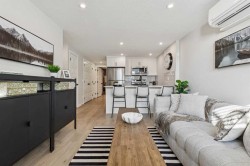 Welcome to the Braeburn at ZEN Mahogany, a stylish, energy-efficient townhome built by a Net Zero builder and constructed beyond the 2030 building code for superior performance and long-term sustainability. Located in one of Calgary’s most sought-after lake communities, this thoughtfully designed 1-bedroom, 1-bath home offers smart, modern living.Built with triple-pane windows, advanced insulation, and high-performance construction standards, this home delivers exceptional comfort while keeping utility costs low. The bright, open-concept layout showcases durable luxury vinyl plank flooring throughout the main living areas, while the bedroom features plush carpet for added warmth and comfort. The contemporary kitchen features quartz countertops and a 6-piece Whirlpool appliance package, blending style and functionality. Photos are representative.