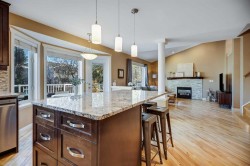 Fall in love the moment you arrive. Tucked away on a quiet Somerset cul-de-sac, this fully finished 5-bedroom, 4-bathroom home offers over 2,600 sq ft of warm, inviting living space designed for both everyday comfort and unforgettable moments. Soaring ceilings and rich hardwood floors set an elegant tone as natural light dances through the living and dining spaces. At the heart of the home, a cozy family room with a gas fireplace invites slow evenings and meaningful conversations, while the updated kitchen—with maple cabinetry, granite countertops, stainless steel appliances, and a welcoming eating bar—becomes the backdrop for morning coffee and lively gatherings. The breakfast nook opens onto an oversized deck, perfect for summer dinners under the stars. A private den, along with a powder room and laundry, completes the main floor—thoughtfully designed for modern living. Upstairs, the primary retreat feels like a sanctuary, featuring his-and-hers closets, a walk-in closet, and a spa-like ensuite with in-floor heating. Two additional bedrooms and a full bath offer comfort and space for family or guests. The walkout lower level is equally enchanting, with a generous rec room, two more bedrooms, and a fourth bathroom with in-floor heat—ideal for hosting or creating your own cozy escape. Step outside to a finished patio and backyard, where quiet mornings and golden-hour evenings await. Just steps from parks, playgrounds, and scenic pathways—and minutes from LRT, shops, and recreation—this home isn’t just a place to live. It’s a place to belong. Call for your private showing.