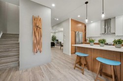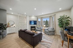 Welcome to The Fairways Vistas, your new home! This recently renovated executive-style townhome offers spacious living paired with stylish comfort and smart design. As you walk in, a mid-century partition opens up to a bright main living area featuring a large bay window that fills the room with natural light and courtyard views. The corner gas fireplace adds warmth and atmosphere, especially during those fall evenings. Next to the living room, a dropped ceiling defines the open dining area, which can also serve as a perfect spot for a home office. Past the main floor powder room is a modern kitchen outfitted with stainless steel appliances, quartz countertops, and elegant oak cabinetry. The practical layout includes generous counter space, a pantry near the range, and an oversized sink with a garburator, making meal prep easy. Hosting is simple with a sizable peninsula that features a built-in microwave, eating bar, and wine fridge. The adjacent breakfast nook is designed for gatherings and gives access to a large rear deck, complete with a gas hookup for barbequing and mature trees for privacy and shade. Upstairs are two large master suites. The primary suite has a walk-through closet leading to a roomy bathroom with a soaker tub, separate shower, and a wide vanity perfect for two sinks if desired. An adjoining flexible space works well as a reading nook, yoga area, or nursery. The second suite overlooks the SE facing courtyard and comes with a walk-through closet with custom wood shelving and upgraded organizers, plus its own full bathroom! The lower level provides a versatile ground-level area accessible from the double garage—ideal for a gym, hobby room, home office or extra storage. It's prepped for a future bathroom if you want to convert it into a lower-level laundry, wine making or mudroom. This home offers more space than most brand new builds and features larger and more private grounds. Premium upgrades including luxury vinyl plank flooring throughout, fresh paint, and updated lighting. Recent updates feature a fiberglass front door, insulated garage door with tinted windows, resurfaced deck and entryway, composite steps with aluminum railing, and improved roofing and gutters. Residents enjoy modern amenities in a mature community, close to golf courses, walking paths, the airport, major traffic routes, and all kinds of shopping. Schedule a visit to discover the comfort and lifestyle this outstanding residence has to offer.