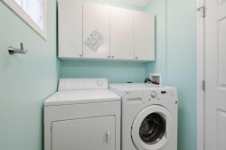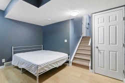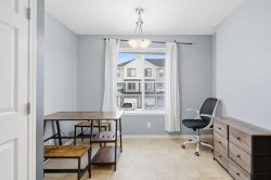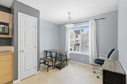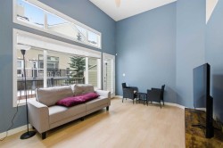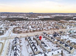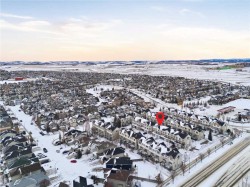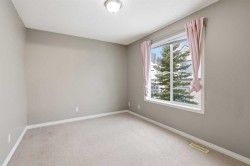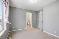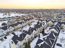 Beautiful sunny end-unit townhome located steps from Fish Creek Park. This low-maintenance townhouse backs onto a green space and features a private deck. The oversized living room offers 14-ft ceilings and tall windows for excellent natural light. Spacious kitchen with maple cabinets, upgraded laminate flooring, black appliances, and a bright breakfast nook.The home includes two primary suites, each with large closets and private ensuites. The lower-level flex space is ideal for a family room, office, gym, or playroom. Attached single garage plus driveway parking. Small pets allowed. Easy access in and out of the complex.