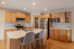 Welcome to this beautifully maintained family home offering a thoughtful layout, functional upgrades including a new roof and new hot water tank, and a backyard retreat designed for everyday enjoyment and entertaining. From the moment you step inside, you are greeted by an impressive open-to-below front entrance that creates a bright and welcoming first impression with soaring ceilings and an abundance of natural light. The main floor features a practical and flowing design, anchored by a spacious living room complete with a tile-surround fireplace and warm wooden mantle—perfect for cozy evenings or gathering with family and friends. The living room opens seamlessly into the kitchen and eating nook, creating an ideal open-concept space for modern living. The kitchen is both stylish and functional, featuring granite countertops, a central island with an eating bar, and a corner walk-through pantry that provides excellent storage and convenience. Select stainless steel appliances complement the space, while the layout allows for easy connection to the dining and living areas. The eating nook offers a large window overlooking the backyard and direct access to the deck, making it a perfect spot for morning coffee or family meals with a view of the outdoors. A main-level laundry room adds everyday convenience and keeps household tasks close at hand. The attached garage is equipped with built-in storage, offering an organized and practical solution for tools, seasonal items, and outdoor gear. Upstairs, the home continues to impress with a spacious bonus room that serves as a versatile space for movie nights, a playroom, or a home office. Two generously sized bedrooms share a well-appointed 4-piece bathroom, while the primary bedroom offers a true retreat. The primary suite features a walk-in closet with custom built-ins and a private 4-piece ensuite complete with a soaking tub and standalone shower—providing both comfort and functionality. The fully finished basement expands your living space with a large recreation and family room, ideal for entertaining, fitness equipment, or a games area. A full 4-piece bathroom completes this level, offering flexibility for guests or growing families. Step outside and enjoy a backyard designed for relaxation and outdoor living. The yard is fully fenced with mature trees, creating privacy and a tranquil setting. A great-sized deck provides space for barbecues and outdoor dining, while the paved cement patio offers an additional seating area for summer evenings and gatherings. An irrigation system ensures the yard stays lush and green with minimal effort. With its open layout, generous living spaces, and beautifully landscaped backyard, this home offers comfort, practicality, and timeless appeal—perfect for families looking to settle into a space that truly feels like home.