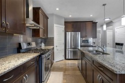Exceptional location meets modern design in this fully finished, highly upgraded home just a 1-minute walk to Cornerstone Regional Park. Enjoy year-round recreation with a scenic pond and walking paths, basketball court, winter ice rink, picnic areas, and playground right at your doorstep. The main floor features an open-concept layout with 9’ ceilings, a stunning 9’ granite island, stainless steel appliances, gas stove, and ample cabinet space—perfect for both everyday living and entertaining. A large main-floor den offers flexibility and can easily be converted into a 6th bedroom or home office. Upstairs you’ll find three spacious bedrooms, each with its own private ensuite, along with a bright bonus room featuring a vaulted ceiling, plus convenient upper-level laundry. The fully finished basement is ideal for extended family or rental potential, offering two additional bedrooms, a full kitchen, bathroom, separate laundry, and a private SEPARATE entrance. Additional highlights include: 220V wiring in the garage for electric vehicle charging. New shingles (2024). New concrete sidewalk to the separate entrance (2019). This thoughtfully designed home offers outstanding functionality, income potential, and an unbeatable park-side location—an excellent opportunity in the heart of Cornerstone.