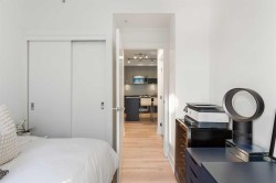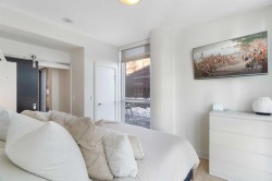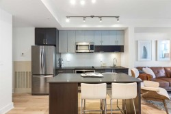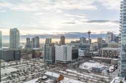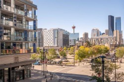 Welcome to #303 in the First East Village — one of the most unique units in the building. This exceptional condo features nearly 300 sq. ft. of private outdoor space with a natural gas line, offering a true backyard-in-the-sky experience — a rare find in downtown living.Inside, you’ll find a bright, modern floor plan enhanced by new light laminate flooring, sleek quartz countertops, and floor-to-ceiling windows that flood the space with natural light. The chef-inspired kitchen offers ample prep and dining space with a dual-purpose island and upgraded stainless steel appliances — perfect for cooking or entertaining.This functional 2-bedroom, 2-bathroom layout is designed for flexibility and comfort. The primary suite easily accommodates a king or queen-sized bed (as shown in photos), while the second bedroom offers versatile space for guests, children, or a home office. Enjoy air conditioning for year-round comfort and seamless indoor/outdoor living through direct access to your private terrace.Residents enjoy access to premium building amenities, including a rooftop patio with BBQ area, party room, guest suite, billiards room, and conference lounge — all available for private booking.This unit also includes one underground parking stall and a dedicated storage locker.Located in the heart of Calgary’s East Village, you’re steps from the RiverWalk, bike paths, Calgary Zoo, dog parks, community gardens, and the upcoming pickleball courts. Walk to nearby grocery stores, cafés, bistros, and local amenities, with quick access in and out of downtown via 6th Avenue or Memorial Drive.A truly rare downtown condo combining modern design, functional living, and exceptional private outdoor space.