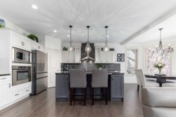 OPEN HOUSE SAT DEC 6TH 3PM-5PM & SUN DEC 7TH 12PM-2PM. Tucked into one of the most coveted areas in Discovery Ridge is 33 Discovery Rise SW. Backing onto Griffith Woods Park & the Discovery Ridge Ponds, this beautifully updated South facing walkout home offers year-round views & daily connection to nature that is rarely found in the city. From glowing West sunsets & summer sun showers to winter mornings & dramatic seasonal skies, the scenery is always changing. Rocky Mountain views to the West paired with sweeping Elbow River valley landscapes delivers a rural feeling with the perks of city living. The front entrance is thoughtfully arranged with a private main-floor office tucked away alongside an elegantly updated powder room. As you enter, you are met with solid hardwood floors flowing throughout the main level, complemented by stain resistant carpet upstairs. The open concept main floor is designed for gathering, blending the kitchen, dining spaces, & living area into one cohesive experience. The great room boasts soaring ceiling heights featuring coffered details with oversized windows framing the stunning views. A striking fireplace finished in sleek tile is double sided to the office & a statement crystal chandelier adds elegance & warmth. Enjoy your updated gourmet kitchen featuring granite countertops, trendy tile backsplash, updated appliances, a spacious pantry, & refreshed two-tone cabinetry. A curated outdoor living space with glass inserts preserving open sightlines, low maintenance Duradek, & a motorized retractable awning come together to provide the perfect setting to get some shade from Calgary’s renowned sunny days or enjoy sun showers & electrical storms. Upstairs, an ideal family layout open to the lower level includes three bedrooms filled with natural light. The primary retreat captures South exposures & West evening glow. The thoughtfully updated ensuite includes a quartz topped dual vanity, stand alone soaker tub, heated floors, & a glass enclosed shower with floor-to-ceiling luxurious tile & a wood accent bench. This leads directly into your custom walk-in closet featuring plenty of hanging, drawers, & open cabinetry to display your favorite designer pieces. The two additional spacious bedrooms are complemented by a 4-piece bathroom, ideal for family & guests. Enjoy the walkout lower level adding remarkable flexibility with radiant in-floor heat, a dedicated fitness room, fourth bedroom, a 4-piece bathroom, & an open media/family space with room for a games area & future bar potential. The triple attached garage provides ample space for vehicles, storage, & seasonal gear. High efficiency furnaces, 2 A/C units, Nest thermostats, humidifiers, an air purification system, & central vacuum provide comfort & ease year-round. All of this is set within one of Calgary’s most desirable, nature connected communities with direct access to pathways & Griffith Woods. Enjoy the lifestyle, quick access to Westhills, downtown, & top tier schools.