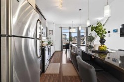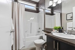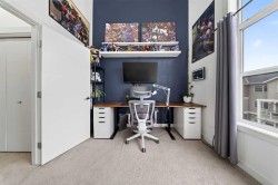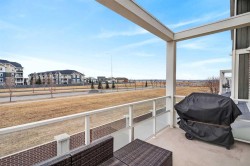 Offering 1,380 sq. ft., this bright END-UNIT townhouse in Redstone features 2 bedrooms, 2.5 bathrooms, a main-level office/den, and an extra-large single attached garage. Enjoy bright sunshine throughout, plus unobstructed mountain views from the second-floor balcony off the dining room and through the large windows in the primary bedroom. Added privacy bonus: no neighbours directly facing your front door.The ground level welcomes you with a spacious front entry and a versatile office/den or recreation space, along with a convenient 2-piece bathroom, an oversized attached heated garage with ample storage, built in desk & shelves, and enough room for a workbench.Upstairs, laminate flooring flows through the open-concept main level. The kitchen offers dark cabinetry, stainless steel appliances, and an extra-large island (ideal for casual seating and hosting), opening to a family-sized dining area with patio doors to the generous balcony with gas line for BBQ—perfect for morning coffee with the views. The living room is anchored by a custom built feature wall/wall unit, creating a stylish and functional gathering space. Show home vibes.The upper level includes a primary bedroom with mountain views, a 4-piece ensuite, and double closets, plus a second spacious bedroom, walk in closet and another 4-piece bathroom. A dedicated laundry and storage room completes the layout. Close to parks, pathways, schools, transit, and major routes for commuting, this Redstone home delivers space, light, privacy, and views.