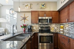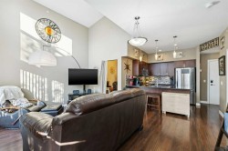 Welcome to Stonecroft Highland Park. Situated on the top floor this single bedroom + den unit features 15ft vaulted ceilings providing a ton of natural light - rare for apartment style condos. Combined with large windows, the height and design create an open, light-filled space that immediately stands out. The functional layout offers thoughtfully designed living throughout. The chefs style kitchen provides excellent cabinet and counter space, complete with granite countertops, stainless steel appliances, and a functional breakfast bar. The primary bedroom is spacious and bright, with large windows and his and hers closets for added storage and organization. A generous 4 piece bathroom and versatile den offer flexibility for a home office, guest area, or additional living space. Additional features include a stacked in-suite washer and dryer, private patio, heated underground parking stall, and separate storage locker. Overall this unit shows pride of ownership throughout! Condo fees include heat and water. The building is well cared for and offers a social room and lots of covered visitor parking. Located on a quiet street next to an off-leash dog park, it provides convenient access to Deerfoot Trail, Centre Street, nearby shops, amenities, and downtown by public transit. An excellent opportunity for comfortable living in a desirable and convenient location. Top floor units in this building don't last long so be sure to schedule your tour before its gone!