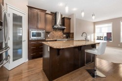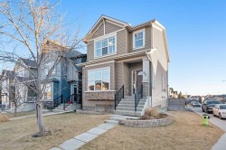 Welcome to this rare-find 4-bedroom plus flex room, 3.5-bathroom home with a fully finished walk-out basement, situated on a corner lot in the family-friendly community of Sage Hill. Built by Morrison Homes and has been maintained by its original owners. This residence offers 2,343 sq ft of developed living space and an exceptionally functional floor plan filled with natural light.The main floor features a versatile flex room with large window, a convenient 2-piece bathroom, and an inviting open-concept living area with 9-foot ceilings. The kitchen is thoughtfully designed with a chimney-style hood fan, full backsplash, induction oven, stainless steel appliances, granite countertops, corner pantry, and a large center island overlooking the dining area and spacious living room. Step outside to the full-sized deck, perfect for summer BBQs and entertaining.Upstairs, you’ll find a generous primary bedroom with a 4-piece ensuite and walk-in closet, along with two additional bedrooms and another 4-piece bathroom.The fully developed walk-out basement offers 9-foot ceilings, sound-insulated ceilings, a cozy family room with gas fireplace, 3-piece bathroom, laundry room, and a fourth bedroom featuring a large walk-in closet and patio door access. The home also includes a dual-zone furnace for added comfort.Recent updates include new asphalt shingles, soffit, and eavestroughs (2025), as well as vinyl siding on the west side (2025). The front, side, and backyard are equipped with underground sprinklers, and the backyard features a double parking pad, ready for a future double detached garage.Conveniently located minutes from T&T Supermarket, Walmart, Planet Fitness, major banks, clinics, restaurants, and more, with easy access to Shaganappi Trail, 144 Avenue, and Stoney Trail.This is a move-in ready home you won’t want to miss. Book your private showing today.