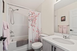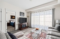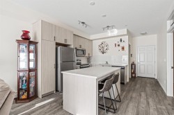 Welcome to this beautifully designed third floor condo in the sought-after community of Legacy. Boasting 752 square feet of modern, open-concept living space, this 2-bedroom, 2-bathroom unit blends style and functionality for comfortable everyday living. Step inside and be greeted by a bright and spacious front living room with oversized, south facing sliding patio doors that flood the space with natural light and lead to your private balcony the perfect spot to enjoy your morning coffee or unwind in the evening. At the heart of the home is a gorgeous kitchen that will inspire any home chef, featuring stainless steel appliances, quartz countertops, a designer tile backsplash and an abundance of cabinetry, all centred around a large central island ideal for casual dining and entertaining. The luxury vinyl plank flooring throughout the main living areas offers both durability and style. Retreat to the large primary bedroom, complete with a walkthrough closet and a private ensuite featuring a stand-up shower. The second bedroom is versatile and would make a fantastic home office, guest room, or workout space. Additional highlights include one titled parking stall, a separate storage locker and in-suite laundry for added convenience. Located in the vibrant and growing community of Legacy, you’ll enjoy quick access to a variety of nearby amenities including shops, restaurants, walking paths, playgrounds, and transit options. Families will appreciate the close proximity to All Saints High School, while commuters will benefit from easy access to major roadways. Don’t miss this opportunity to own a stunning top-floor unit in one of Calgary’s most desirable neighbourhoods.