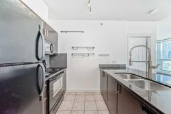 Welcome to Riverfront Pointe! This bright 7th floor west corner suite offers 2 bedrooms, 2 bathrooms + a flex/office area with unobstructed views of the Bow River and Downtown skyline. The open-concept layout features granite counters, designer tile backsplash, black appliances, eating bar, laminate flooring, and floor-to-ceiling windows that flood the home with natural light. The primary bedroom includes a 4-piece ensuite, while the second bedroom and full bath add flexibility for guests or a home office. In-suite laundry adds everyday conveniencBuilding amenities include a fitness centre, landscaped courtyard, concierge service, keyless entry, bike storage, and a titled underground parking stall located just steps from the elevator. Enjoy the ultimate urban lifestyle—walk to the Calgary Zoo in 10 minutes, City Hall LRT in 2 blocks. Enjoy being steps away from river pathways, parks, Chinatown, Eau Claire, and the best of downtown dining and entertainment.An excellent investment opportunity—previous tenant paid $2,500/month. Pet-friendly (with board approval).