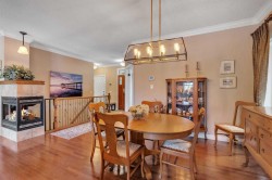 RARE OPPORTUNITY to own this immaculate 55+ walkout bungalow-style villa backing directly onto greenspace—with no neighbours behind! Tucked into one of the best locations in the community, this home is ideal for empty nesters and downsizers seeking a low-maintenance lifestyle without sacrificing space or comfort. From the moment you step inside, you’ll notice the executive upgrades including 9’ ceilings, custom crown moulding, and hardwood flooring throughout the main level. The layout is bright and functional with a spacious tiled front entry, a front den/office with large windows, and a formal dining area perfect for hosting. The kitchen offers granite countertops, corner pantry, an updated tile backsplash, and newer stainless-steel appliances including a fridge with water and ice, dishwasher, and microwave hood fan. The adjacent eating nook showcases unobstructed greenspace views and leads to the deck—a perfect spot for morning coffee or quiet evenings outdoors. The living room is warm and inviting and includes a three-way fireplace. The primary suite is a great size and features a walk-in closet and a beautifully updated ensuite with heated floors, a tiled shower and Jacuzzi tub. The main level is complete with a powder room and convenient laundry with new washer and dryer (2024). Downstairs, the walkout lower level expands your living space with a large family room featuring a gas fireplace, built-ins, a spacious additional bedroom, and a full bathroom. There’s also a versatile room that is ideal for an office, hobby space, rec room, or potentially an additional bedroom plus plenty of storage. Additional highlights include air conditioning, and a central vacuum system. Best of all: no condo fees—just a low $180 HOA fee covering lawn care, snow removal, and irrigation, making this an ideal turn-key option for those looking to simplify and enjoy life. With easy access to Stoney Trail, shopping and amenities this move in ready villa is not to be missed!