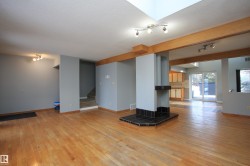 This Marler-area 2-storey backs onto a green belt with no rear neighbours and offers space, function, and flexibility. Featuring 3 bedrooms and an open-concept main floor with vaulted ceilings, skylights, and open-to-below living and dining areas, the home is bright and welcoming. The kitchen and dining area provide easy access to the large rear deck for BBQ season. A half bath and access to the former front garage—now a heated recreation space with bar and pool table—complete the main level. A standout feature is the massive rear attached garage with alley access, in-floor heat, 220 power, hot and cold water, mezzanine storage with electric winch lift, and ample space for vehicles and a dedicated workshop. The basement adds a second living area and flex space ideal for an office or playroom. Outside, enjoy a fully fenced yard, large deck with hot tub, and added privacy with green space beyond the alley. A well-loved home offering room to live, work, and create.