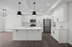 BRAND NEW SEMI DETACHED | LOADED WITH UPGRADES | SEPARATE ENTRANCE. Welcome to this brand new semi-detached home with a front double attached garage, perfectly located in the desirable community of Waterford. Designed with style and functionality in mind, this home boasts numerous upgrades throughout.Step inside to a bright, open foyer leading to the main floor, featuring 9-foot ceilings and beautiful engineered hardwood throughout. The open-concept kitchen showcases quartz countertops, stainless steel appliances, upgraded light fixtures, and painted cabinetry to ceiling height. It flows seamlessly into the spacious living room with an electric fireplace and dining area overlooking the large backyard — ideal for summer BBQs and outdoor entertaining. A convenient 2-piece bathroom completes the main level.Upstairs, the home offers three generously sized bedrooms, each with ample natural light and closet space. The primary suite is a true retreat, featuring a spacious walk-in closet and a luxurious ensuite with dual vanities. The additional bedrooms are perfect for family, guests, or a home office, and share a well-appointed 4-piece bathroom. Completing the upper level is a full-size laundry room for ultimate convenience.The unfinished basement includes a separate side entrance, providing flexibility for a future living space, guest suite, or investment opportunity.Tucked away on a quiet street, this home is just minutes from all the amenities Chestermere offers, including schools, parks, shopping, and the lake