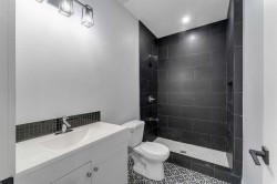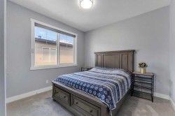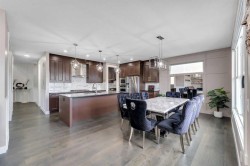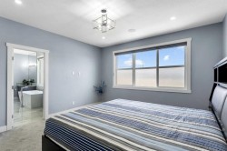 Experience luxury living in this 2700+ sqft custom-built home located in the heart of Chestermere—just steps from the canal, ideal for peaceful walks or bike rides to Calgary for those with an active lifestyle. This west-facing home offers striking curb appeal with an exposed aggregate driveway, vinyl fencing, extended cement walkway, and a maintenance-free backyard patio with BBQ gas line. Step into a grand open-to-below foyer with 8ft doors throughout the main level, paired with 9ft knockdown ceilings, wainscoting, feature walls, and engineered hardwood floors. The main level also features a dedicated flex room, open mudroom with dual coat closets, motorized blinds throughout, and is roughed-in for central vacuum. The chef’s kitchen is a true showstopper, complete with an oversized island, granite countertops throughout, soft-close cabinetry to the ceiling, two gas ranges, two dishwashers, a built-in oven and microwave, high-powered hood fan, and a fully equipped spice kitchen with garburator. The great room showcases a floor-to-ceiling tiled gas fireplace with in-ceiling speakers, creating a perfect space for hosting. Upstairs features 4 spacious bedrooms, including 2 master suites. The primary retreat boasts a spa-like 5-piece ensuite with a standalone tub, custom steam shower, double vanity, ceiling-height mirrors, toilet with window, and a walk-in closet with built-ins. The second master includes its own 4-piece ensuite with stand-up shower. Two additional bedrooms and a full bath with stand-up shower complete the upper level, along with a bonus room with feature wall, laundry room with sink, and Cat5 wiring. The fully finished basement features a separate side entrance, 2 bedrooms, a full bathroom with tiled stand-up shower, laundry and kitchen rough-ins, a storage room, and a large open family room—ideal for extended family or future suite development (subject to approval and permitting by the city/municipality). Additional highlights include a heated, insulated garage with gas line, home security system with 7 cameras + NVR, AC rough-in, and the peace of mind of remaining new home warranty!