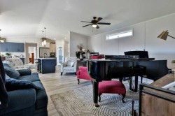 Welcome to The Seasons in Coaldale — where modern luxury meets easy living.Prepare to be amazed by this 2024 modular home that redefines what one-level living can look like. With 1,550 sq. ft. of thoughtful design and tons of upgrades, this home is proof that modular living can be stylish, spacious, and sophisticated.From the moment you arrive, the curb appeal sets the tone: a large fenced yard with underground sprinklers, lush sod, extra gravel parking, and a paved double pad. Step onto the covered deck, where you can sip your morning coffee rain or shine, and take in the peace of having no neighbors behind you — just open field views and green space beside.Inside, the home feels as grand as it is warm. High ceilings, expansive windows, and an open layout fill the space with natural light. The living room easily accommodates a grand piano (and yes, there’s one here now!).The kitchen is incredible:• Two-tone cabinets (creamy uppers + mystic blue lowers) with a premium velvet finish• An oversized island with extended eating bar and pendant lighting• Full backsplash, pot lights, and a walk-in pantry• Stainless steel appliances including a French-door fridge/freezer, ceran-top stove, OTR microwave, dishwasher, and deep stainless farm sinkThe dining area offers space for a large table and a desk area and even built-in cabinets.The primary retreat is everything you’d expect — a spacious bedroom with a walk-in closet and a spa-like ensuite featuring double sinks, tiled walk-in shower with glass doors, linen storage, and extra cabinetry. Two additional bedrooms also feature walk-in closets and share a well appointed 4-piece bathroom.Thoughtful touches continue throughout: craftsman-style doors with lever handles, black obsidian fixtures, extra cabinets in the laundry room (with its own sink, exterior door, and room for a freezer or dog run access), plus upgraded exterior doors with glass inserts for more light.Outdoors, the possibilities are endless: a garden, playground, or dog run — there’s room for it all. And as a resident of The Seasons, you’ll enjoy walking and biking paths, a scenic pond, RV storage, and a friendly, pride-filled community. With low utilities, property taxes, and condo fees, this home offers both beauty and value.If you’ve been waiting for a modular home that feels nothing like compromise — this is it. Bring your grand piano, your pets, your dreams of easy luxury living… and make this one yours.