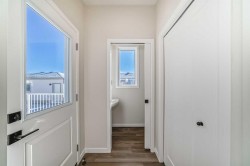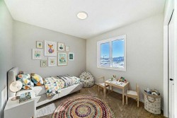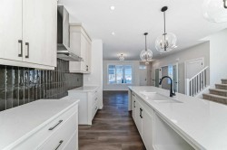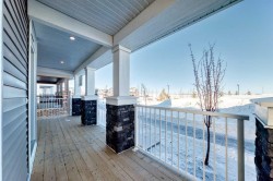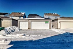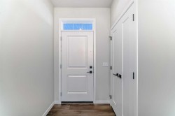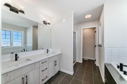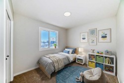 Welcome to the Forrester—a rare, family-friendly porchfront home fronting directly onto the park, paired with a triple detached garage and a driveway/parking setup that can accommodate up to six vehicles. This is the kind of combination that’s almost impossible to find, and it delivers a lifestyle that feels special from the moment you arrive. Start your mornings on the spacious 225 sq ft front porch, coffee in hand, watching the park come to life—perfect for playdates, dog walks, or simply enjoying an open view right outside your front door. Inside, the home is bright and welcoming thanks to large windows at both the front and back, carrying natural light deep throughout the day and every season. The main floor is designed for real life: a generous front living room and a flexible main-floor flex room (office, playroom, craft room—your call) lead into an open-concept layout anchored by a modern galley-style kitchen. You’ll love the elevated finish package here, including two-tone cabinetry, full-height upper cabinets, soft-close doors, quartz countertops, striking black hardware, and an upgraded chimney hood fan with built-in microwave. A large central island makes everyday meals and entertaining easy, while the oversized walk-in “Costco-ready” pantry keeps everything organized. Luxury vinyl plank flooring flows throughout the main level, tying it all together with a clean, contemporary feel. Off the rear entry, the mudroom adds practical function—complete with a private powder room that’s ideal for busy family routines. Cozy evenings are effortless in the open living space with a contemporary gas fireplace (cantilever-style feature), and the home is already set up for outdoor hosting with a gas line for the BBQ. For home chefs, you’ll also appreciate the gas line to the kitchen range—ready for your preferred cooking setup. Upstairs, you’ll find three bedrooms arranged for comfort and privacy, including winged secondary bedrooms that help keep everyone’s space their own, plus a convenient upper laundry room. The owner’s suite is a true retreat with no directly shared walls, a dramatic vaulted ceiling, large bright windows overlooking the park-facing front yard, a spacious walk-in closet, and a spa-inspired 5-piece ensuite with a soaker tub and dual vanities. Finishing touches like metal stair railings add to the home’s modern, upscale feel. Outside, the standout continues: a large triple detached garage, plus an exceptional amount of additional parking—whether it’s guests, toys, or a growing household, this is a game-changer. A park-front location, a triple garage, parking for up to six, and a well-curated interior finish package—this Forrester checks boxes that rarely come together in one home. Living in Vista Crossing means enjoying the best of both worlds: the convenience of city living just a short drive from Calgary, paired with the charm and slower pace of small-town life in Crossfield. This thoughtfully planned community fosters a strong sense of belonging.