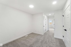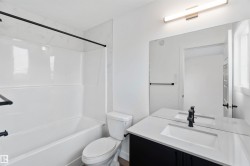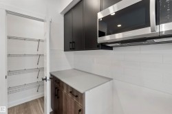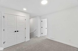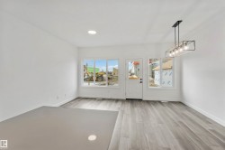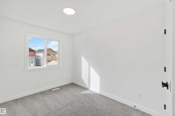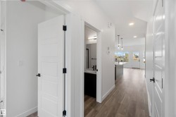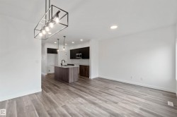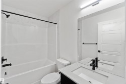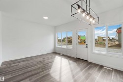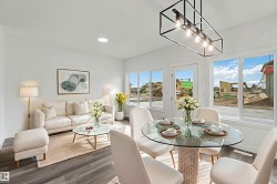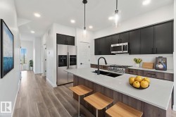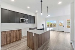 Welcome to the Sapphire by Sterling Homes, a 1,615 sq. ft. home designed for efficient modern living. The main floor features luxury vinyl plank flooring and 9’ ceilings, with a bright open layout that includes a main-floor bedroom and a 3-piece bath with walk-in shower. The kitchen offers quartz countertops, an island with flush eating ledge, Silgranit undermount sink, over-the-range microwave, tiled backsplash, upgraded Winston cabinetry with soft-close doors and drawers, and a corner pantry. Large windows, pendant lighting, and a garden door fill the living area and nook with natural light. Upstairs includes a bonus room, primary suite with walk-in closet and 3-piece ensuite, two additional bedrooms, a 3-piece main bath, and a laundry closet for stackable washer and dryer. Black plumbing and lighting fixtures, separate side entrance, 9’ ceilings on main and basement levels, basement rough-in, and Sterling Homes’ Signature Specification complete this home.