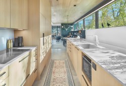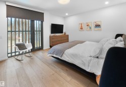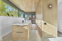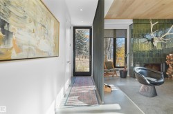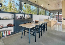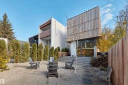 Designed by Edmonton City Architect Carol Belanger, this remarkable Old Glenora residence reinterprets the low-slung modernist home that once stood on the site. With over 2,800 sq. ft. of finished living space, it balances heritage and innovation with quiet confidence. The striking stone chimney, painstakingly rebuilt from salvaged materials, anchors the home in its history while defining a new architectural chapter. Inside, a luminous ribbon window traces the south façade, framing open horizons and intimate moments in equal measure. Wrapped in warm wood and textural stone, the upper level appears to float, a refined nod to a modern tree fort. Light shifts gently across each surface throughout the day, revealing new tones and textures. Every material, polished concrete, natural textural wood, cold-rolled steel, and verdant tile, contributes to an atmosphere of enduring craftsmanship and understated luxury. This is contemporary Edmonton living, rooted in legacy and elevated by design.