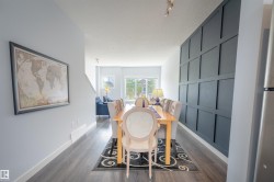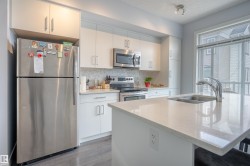 Welcome to this modern townhouse for sale in Griesbach, one of Edmonton’s most sought-after communities! This move-in ready home features an open-concept main floor with durable vinyl plank flooring, A/C, and abundant natural light. The bright white kitchen offers ample cabinetry, a large island, stainless steel appliances, and direct access to a private deck—perfect for BBQs and outdoor entertaining. The dining area showcases a stylish feature wall, while the spacious living room includes a large front window. Upstairs, enjoy a generous primary bedroom with double closets, a second well-sized bedroom, and a 4-piece bathroom. The lower level includes a versatile flex space ideal for a home office, gym, or guest room, plus a convenient 2-piece bath and direct access to the oversized attached garage. Located steps from parks, green spaces, walking trails, schools, and shopping, this home is ideal for first-time buyers, professionals, or investors. A fantastic opportunity in a family-friendly neighbourhood!