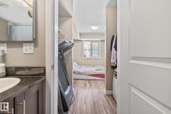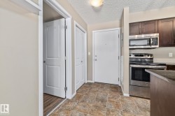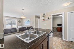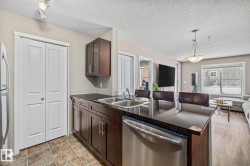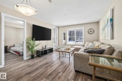 Welcome to this bright 2-bedroom + den, 2-bathroom ground-level condo in the desirable community of Chappelle. This open-concept home offers a functional layout filled with natural light and direct access to your private ground-floor outdoor space. The modern kitchen features granite countertops, stainless steel appliances, and a raised eating bar overlooking the dining and living areas, perfect for everyday living and entertaining. The primary bedroom includes a full ensuite, while the second bedroom and bathroom are thoughtfully positioned for privacy. Brand new Vinyl flooring throughout and the added den provides flexible space for a home office or hobby room. Enjoy in-suite laundry with front-load washer and dryer, plus ample storage. Complete with TWO titled parking stalls. One underground and one above ground. Close to shopping, parks, golf, transit, Anthony Henday, and within walking distance to the new Don Getty K–9 School. You wont find a more meticulously owned unit at this price point.