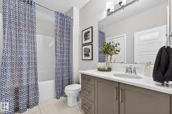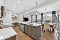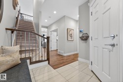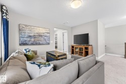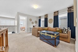 Former Showhome offering over 2,100 sq ft of thoughtfully designed living space in a prime location! The main floor features a large den that can be used as a bedroom, with convenient access to a 4-piece bathroom, stylish laminate flooring, a stunning kitchen with large pantry, centre island, quartz countertops, and modern two-tone cabinetry. Patio doors to outdoor living with a composite deck complete with privacy screen.The open-to-above living room boasts impressive 18-ft ceilings, leading to a cozy upper bonus room perfect for relaxing. Upstairs you’ll find 3 spacious bedrooms, a full 4-piece main bath, and a primary suite with 4-piece ensuite, walk-in closet, and closet organizers. A full upstairs laundry room adds everyday convenience. Additional highlights include a 24x18 double attached garage, fully fenced yard. Located close to walking trails, elementary and junior high school, and within walking distance to all amenities. Great location close to major commuter road, Anthony Henday Drive.