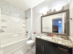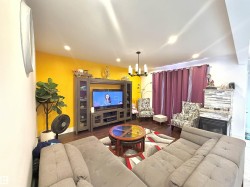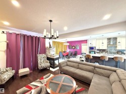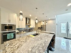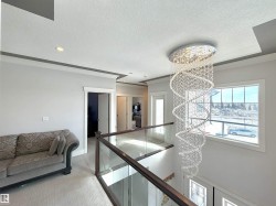TRIPLE ATTACHED GARAGE | SEPARATE ENTRANCE | 2 FURNACES | CENTRAL A/C. This 3,328 sq ft above-grade home offers exceptional space and functionality. Grand foyer with soaring ceilings, custom tile, upgraded lighting, and glass-railing staircase. Open-concept main floor with spacious living and dining areas featuring a see-through fireplace. Gourmet kitchen includes large granite island, high-gloss cabinetry, stainless steel appliances, and ample storage. Main floor bedroom with 4-pc ensuite plus additional 3-pc bath. Upstairs features bonus room with balcony access, laundry, and 3 spacious bedrooms. The primary retreat boasts a 5-piece spa-inspired ensuite with Jacuzzi tub, standing shower, and custom walk-in closet. Fully finished basement with separate entrance includes kitchen, 3 bedrooms, separate laundry, 4-pc ensuite, and 3-pc bath. Walking distance to ravine trail, close to K–9 and high school, the airport, and quick access to Anthony Henday Drive.