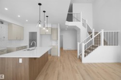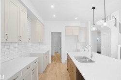Welcome to the "Chelsea" built by the award-winning builder Pacesetter homes located in the heart of the Aster and just backing the natural reserve. As you enter the home you are greeted by luxury vinyl plank flooring throughout the great room ( with open to above ceilings) , kitchen, and the breakfast nook. Your large kitchen features tile back splash, an island a flush eating bar, quartz counter tops and an undermount sink. Just off of the kitchen and tucked away by the front entry is a main floor bedroom and a 3 piece powder room. Upstairs is the primary bedrooms retreat with a large walk in closet and a 5-piece en-suite. The second level also include 2 additional bedrooms with a conveniently placed main 4-piece bathroom and a good sized central bonus room. Close to all amenities and easy access to the Henday and the white mud trail. This home is now move in ready !