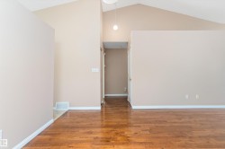 Welcome home to this beautiful bungalow in desirable Cumberland, Edmonton! Tucked away on a quiet street just steps from a park, this well-cared-for home shows true pride of ownership. The main floor features 14' vaulted ceilings, a cozy gas fireplace, rich hardwood floors, and ceramic tile in the kitchen. Enjoy a bright, open layout with with cabinets and a kitchen sink overlooking your west-facing backyard—perfect for sunsets on the permitted deck. The primary bedroom includes a convenient 2-piece ensuite, while a second bedroom a 4-piece bath and laundry room complete the main level. The open basement offers great potential to add two more bedrooms and a spacious family room. Additional highlights include a single attached garage with direct home access, vinyl siding and windows, 50-year shingles, a sump pump, and large above-grade basement windows. Relax on the front porch with your morning coffee & enjoy this quiet, family-friendly community. Close to all amenities, Move-in ready and waiting for you!