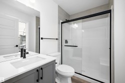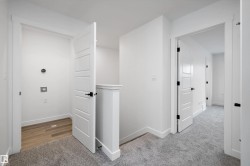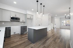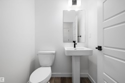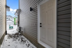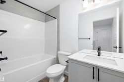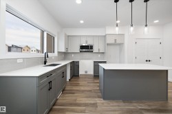 Welcome to the Sansa Model by Sterling Homes, a thoughtfully crafted home that blends modern style with smart functionality. Enjoy 9’ ceilings on both the main and basement levels and luxury vinyl plank flooring throughout the main floor, creating a bright and open atmosphere. The front great room is filled with natural light and flows seamlessly into the dining area, ideal for everyday living and entertaining. The rear L-shaped kitchen features quartz countertops, a central island with flush eating ledge, soft-close Thermofoil cabinetry, a spacious pantry, and a Silgranit undermount sink overlooking the backyard. A separate side entrance adds flexibility, while the rear entry offers a half bath, yard access, and a parking pad with the option for a detached double garage. Upstairs, the primary suite includes a walk-in closet and 3-piece ensuite with glass walk-in shower, complemented by two additional bedrooms, a full bath, upper laundry, black fixtures, and basement rough-in plumbing.