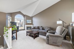 Welcome to the exclusive gated community of Village Green in desirable Twin Brooks. Nestled on a quiet street away from the hustle and bustle of the city, but still having access to public transit, shopping and schools. This stunning bi-level features soaring vaulted ceilings as you step into the home, showcasing the spacious open concept living. The livingroom has a cozy corner gas fireplace and large bay windows. The kitchen has expansive countertops with an eat up bar and newer dishwasher, fridge & microwave hood fan as well as a corner pantry. Functional dining space opens onto your private deck with access to your manicured lawn; maintained by the condo! The main floor has 2 bedrooms, 4 piece main bath and primary has ensuite & walkin closet. Basement has large windows, big family room, large 3rd bedroom and another full bathroom! Attached garage is perfect for winter! Also has A/C! The community is quiet & features greenspace.