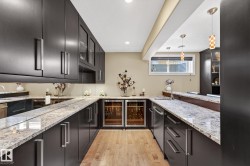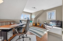 This beautiful, spacious bungalow with a unique loft design is located on a quiet crescent in the Hodgson community, with convenient access to both the Henday and Whitemud. It offers 4 beds, 4 baths (two with in-floor heating), two gas fireplaces, a main floor den, and a large laundry room with in-floor heating. The home showcases a highly functional layout. The gourmet kitchen features abundant counter and cabinet space, high-end appliances, granite countertops, and hardwood floors throughout. The private upstairs loft includes a bonus room, bedroom, and 4-piece bath. The fully finished basement offers a cozy family room, a large wet bar with two built-in bar fridges and a dishwasher, plus a theatre room with built-in surround sound. Additional features include a new roof, hot water tank, and washer and dryer (all installed in 2023), along with central air conditioning. The professionally landscaped yard with irrigation, a circular brick patio, and two sheds completes this exceptional, well-kept home.