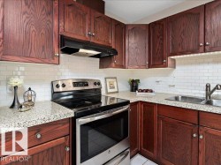 Located in the heart of Rossdale, stones throw to our iconic River Valley and Legislative Grounds you'll find this gorgeous condo. Featuring 2 bedrooms , 2 full bathrooms, large peninsula style kitchen with loads of cabinets, breakfast bar, newer Corian countertops (also done in both bathrooms), ceramic flooring & spacious dining area. The livingroom has a cozy gas fireplace, upgraded laminate flooring, numerous SW windows that provide much sunlight and access to spacious circular balcony. Good sized bedrooms, ample storage , newer central air-conditioner/furnace, 6 appliances and 1 underground parking stall (53). Just minutes to many of Edmonton's finest attractions including Rogers Arena, Folkfest, Accidental Beach, dining, grocery as well as the University & LRT System. In 2015 the building went through a major upgrade: stucco off to 40 year "Hardie Plank" board, roof, attic insulation, windows, balconies/railings & dura-decking. Reasonable condo fee's incl heat and water. See today!