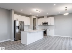 This beautifully designed 2-storey home showcases stylish vinyl plank flooring throughout both the main and upper levels. The modern kitchen is a chef’s delight, featuring a spacious central island with quartz countertops, stainless steel appliances, and a generous walk-in pantry. The adjoining dining area is perfect for both everyday living and entertaining, with patio doors leading out to the fenced backyard. Upstairs, a versatile bonus room offers extra living space, complemented by two secondary bedrooms, each complete with its own walk-in closet. The primary suite is a true retreat, boasting a 4-piece ensuite and a large walk-in closet. For added convenience, the laundry room is also located on the upper level. Stillwater is a family-friendly community offering fantastic amenities including a skating rink, Zamboni House, splash park, playground, basketball courts, and scenic trails.