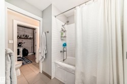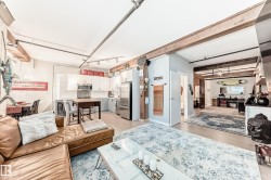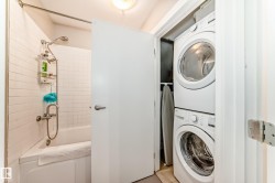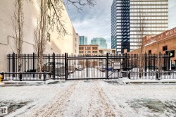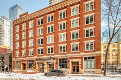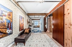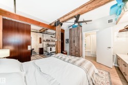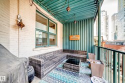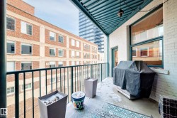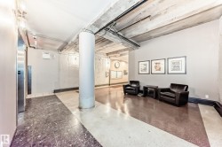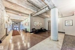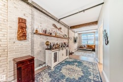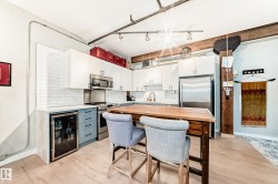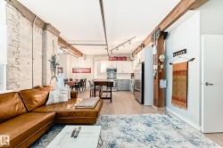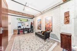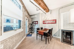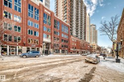 Pristine studio loft in the historic Phillips Lofts. This stunning warehouse-style unit offers 1,050 sq. ft. of open-concept living w/ exposed brick, original timber beams, 9’ ceilings, & massive windows throughout. Thoughtfully renovated while preserving its character, the kitchen features new quartz countertops, new tile backsplash, refinished cabinets w/ new hardware, deep single-basin sink, & updated faucet, along w/ a premium LG induction range, LG over-the-range microwave, & Danby beverage centre. Custom built-in wardrobe cabinetry includes clothes rail, upper storage, & dimmable LED lighting, maximizing functionality while maintaining the loft aesthetic. Additional storage added w/ a new custom shelf in the front closet. The 4-piece bath includes new full-size LG washer & dryer, & a pocket-door. Maple hardwood floors have been professionally refinished, & the private balcony is enhanced w/ Turkish pendant lighting. Unbeatable location steps from Rogers Place, Jasper Ave., restaurants, cafés, &LRT.