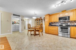 Top Floor Living Just Minutes from West Edmonton Mall! This bright and spacious top-floor condo offers an ideal layout in a prime location close to all amenities and services. The welcoming entryway leads into a beautifully upgraded kitchen featuring granite countertops, newer appliances, ample cabinetry, and generous pantry space—perfect for both everyday living and entertaining. The open-concept design overlooks the living room with a cozy corner gas fireplace and patio doors opening to a large private deck. Enjoy the convenience of a roomy in-suite laundry area and two well-sized bedrooms. The huge primary suite boasts double closets and a 3-piece ensuite with a walk-in shower. A spacious second bedroom and a full 4-piece bathroom complete the interior. This unit includes two underground parking stalls, one with an attached storage cage, adding exceptional value and convenience. An excellent opportunity for professionals, downsizers, or investors seeking comfort, location, and lifestyle.