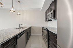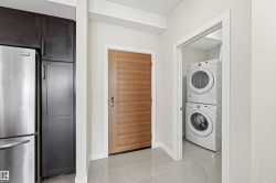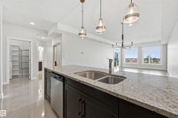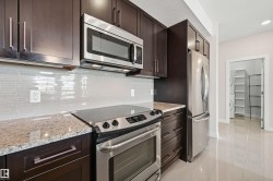 Experience luxury living at Brass III The Leger in the desirable Riverbend. This top-floor unit offers city views, showcasing craftsmanship & a well functioning floorplan. The bright, open layout features 9 ft ceilings, engineered hardwood, granite countertops, S/S appliances, maple shaker cabinets & an island w/eating bar. Living area will accommodate most furniture arrangements. Bedrooms are on opposite ends for privacy. The spacious primary suite includes a walk-in closet w/built-ins and a 4pc ensuite w/soaker tub & glass shower. 2nd bedroom for guest stays or home office/hobby studio. 3pc bathroom w/matching finishing palette. Enjoy the balcony for evening bbqs, central A/C, in-suite laundry. Double tandem underground parking stalls w/storage. Well managed complex w/healthy reserve fund. Pet-friendly & ideally located near Terwillegar Rec Centre, schools, parks & all servicing amenities. This residence combines elegance, comfort & convenience in one of Edmonton’s most sought-after communities.