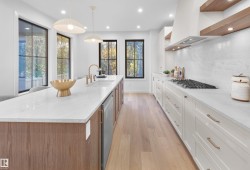 This meticulously designed home showcases high-end finishes, superior craftsmanship, & backs onto the ravine! With over 4,200 sq ft of living space, it offers 4 bedrooms + a den, a main floor office, & a massive upper loft with a rooftop patio. The main floor features stunning hardwood, custom iron doors, brick accents, & a chef’s kitchen with elegant cabinetry, panel appliances, dual fridges, built-in ovens, & bookmatched countertops. A dining wet bar includes a built-in beverage fridge, while the living area centres around a plaster fireplace with built-in cabinetry. The primary suite boasts a gorgeous, spa-like en-suite and a large walk-in closet. Upstairs are 3 bedrooms, a den, & 3 full baths. The top-floor loft impresses with a wet bar, 2 pc bath, & rooftop patio with a gas fire table overlooking the ravine. The lower level offers in-floor heat, a rec room, a bedroom, & bath. Oversized heated garage with epoxy floors & south yard with covered deck complete this must-see home!