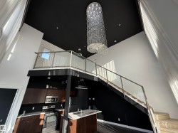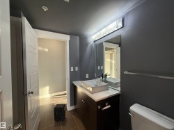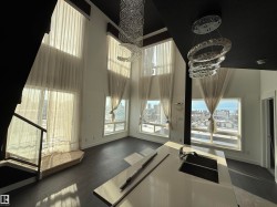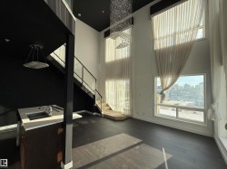Bask in sunlight from this stunning corner penthouse designed to impress. 9' ceilings throughout rise to a dramatic 18' in the living and dining area, creating a breathtaking sense of space. This layout offers 2 bedrooms plus a den and loft, paired with 2 beautifully finished bathrooms. The south-facing balcony floods the home with light, while laminate flooring with in-floor heating adds comfort and style. The spacious kitchen features sleek quartz countertops and appliances, perfect for entertaining. Enjoy the convenience of stacked laundry and elevate your lifestyle with a private, expansive rooftop deck—your own urban escape above it all. Property is sold as is where is at the time of possession, no warranties or representation.
