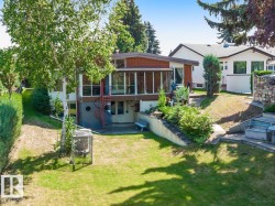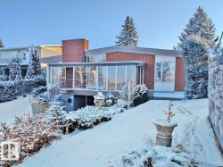 River Valley View! Opportunity knocks with this lovely mid century modern home with walkout basement backing directly onto our beautiful river valley. Remodel, renovate, or rebuild; the choice is yours. Situated on a 19.81m (approx. 65 feet) wide lot, this big post and beam bungalow offers over 1,800 square feet above grade. Watch the seasons change from the large living room with huge windows looking directly over the valley. Vaulted ceilings continue over the spacious kitchen and dining room. The main floor also hosts the primary bedroom with ensuite, two more bedrooms, a full bath and a large laundry room, plus access to the double attached garage. Downstairs in the walkout basement you’ll find a massive family room, a fourth bedroom, a full bathroom plus plenty of storage. Across the back of the home the sunroom looks out to the river valley. The lot is over 860+ square meters with beautiful mature trees, gardens and landscaping. Appliances are included; all that’s missing is you, so let’s get moving!