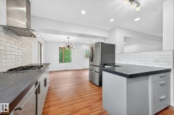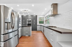 We have the perfect house waiting for you in Bonnie Doon! This 2400 sf home (3000sf including the basement) has four bedrooms, kids rooms are on the east wing of the home and the enormous primary is on the west wing. As soon as you walk in the door you're greeted with an impressive set of metal work and Brazilian hardwood stairs. The main floor has newly refinished hardwood throughout, there is a gas fireplace in the living room .(THREE gas fireplaces in the home) The kitchen has new backsplash and is well lit with an abundance of windows and natural lighting. There is a dining room that leads out to your deck area. Head back to the foyer and you will find access to your oversized double attached garage!! Garage is heated and has epoxy flooring. The basement features a media room and another fireplace and cork flooring. The primary bedroom has a huge 5 piece ensuite, another gas fireplace and walk in closet. This home is situated mere minutes to Mill Creek Ravine, schools, downtown, Whyte Ave.