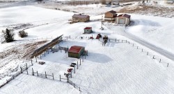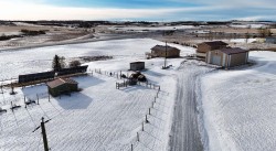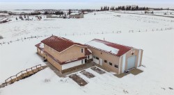 Exceptional 24.02-acre property with breathtaking 360° views of the countryside, sunrises, sunsets, and the Rocky Mountains. Fully fenced and gated, this former licensedcommercial operation features extensive concrete walkways, patios, and aprons. A year-round headwater spring feeds three connected ponds with agricultural water rights. Thehome offers a wrap-around deck, walkout lower level, hardwood floors, 3 bedrooms,multiple baths, a Vermont Castings wood-burning heater, spacious rec room, ample storage and radon mitigation. A well-designed fully PERMITTED COMMERCIAL COMPLEX (cost to build today $800k) includes a 2-storey COMMERCIAL CODE office/studio building, PLUS single-storey attachedwarehouse/storage area. These are connected via a reception/foyer to a HUGE MULTI PURPOSE WORKSHOP with 12’x12’ overhead door. All are extensively serviced with hydronic heating, heated concrete floors, A/C (select buildings), Vacu-Flo, security and intercom systems, hail-resistant roofing, and robust utilities. There is a well supplied 3,000 gallon cistern, multiple hydrants, a stock waterer and annually maintained septic system. Buildings have softened water throughout, with distilled drinking water in the house kitchen. The property boasts a grid-tied SOLAR system ($75k to build) with surplus power credits ($3,200 in 2025), and 22 kVA automatic standby diesel generator. Ideally located with quick access to Calgary, Okotoks and High River, also on a school busroute, with hayed fields and excellent potential for subdivision, secondary suite, or home-based business (County approval required).