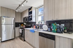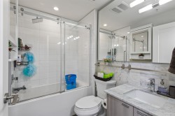 Beautiful South-East corner unit in "Hudson's Loft" conveniently located in trendy Central Village, where you are steps away from trendy restaurants and cafes. This corner unit with over +600 square foot of living space + balcony and features tons bright natural light. 2 Underground parkings side by side and storage locker. Modern contemporary kitchen with stainless steel appliances and high end quartz countertops. Thoughtful floor-plan with enhanced privacy featuring bedrooms on opposite sides. Open house 12:00-2:00pm on June 28 & June 29