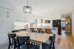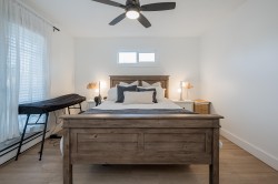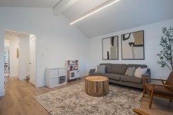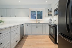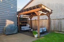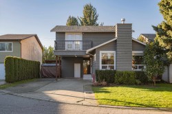 Beautifully updated home with a private-entry 1-bedroom suite on a quiet dead-end cul-de-sac. Bright, open kitchen/eating area offers a breakfast bar with quartz counters, ceramic tile backsplash, under-cabinet lighting, and French doors to a private backyard. Family room features large windows, cozy gas fireplace, vaulted ceiling with white-washed shiplap, and designer lighting. Updates include wide plank laminate floors, fresh designer paint, new lighting, and vinyl windows. Upstairs: 3 bedrooms, including a primary with his & hers closets and its own balcony. Fully fenced, manicured yard with a covered outdoor living space, firepit, and paving stone patio. Close to Terry Fox Elementary, parks, and historic downtown Abbotsford.