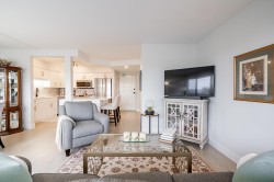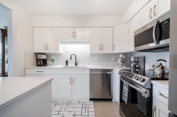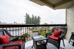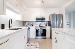 Bright and spacious fully renovated unit ready for you to enjoy! With large kitchen & island, SS appliances, quartz counters, tile backsplash, and ample cupboard space. Living room features large windows w/ custom blinds and a view of Mt. Baker from your covered deck, spacious dining area perfect for entertaining. Bedroom features walk in closet. Second bed/den with french doors leading to living rm. Unit includes modern light fixtures, all new interior doors/trim, and new flooring throughout. New Bathroom with walk-in shower & waterproof flooring. New In suite Washer/dryer. Storage locker inc. Evergreen Village also has indoor pool, hot tub, gym, guest suite, games rm, workshop, & RV parking. Centrally located near shops, restaurants, parks, and transportation. Heat inc in strata fee.