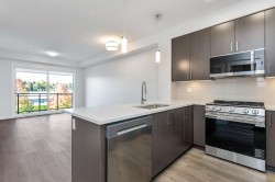 Welcome home to this shiny and new, stunning 730 sq. ft. 2-bed, 1 bath condo, in beautiful Jacob. A new 6-storey, modern development in Central Abby! Tree-top views, and an abundance of natural light! Skillfully designed with beautiful finishes, and maximum use of space! Gorgeous kitchen with elegant and classic dark cabinetry, quartz counter tops, under-mount lighting,S/S appliances, soft-close drawers.Upgrades incl. gorgeous laminate floors and 2x6 micro locker. Beautifully landscaped, with a 'gathering' space, plus a safe play area for the 'littles'! Conveniently located near the historic downtown core, you'll enjoy a wonderful array of shops, restaurants, and cozy cafes. Close to UFV, and all level of schools. Move-in ready! Perfect for first-time Buyers, down-sizing or investment!