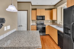 Welcome to Citadel Ridge in Central Abbotsford! Rarely available oversized END UNIT 1 Bedroom + 1 Bathroom located on the 3rd floor of this well built and secure building. Boasting 840 Sq Ft (not a typo!) this condo features a functional kitchen with granite countertops, island & window, large bedroom with AC unit and 2 closets, bathroom with double sink, shower and soaker tub, dining space, and also open living room with 2nd AC, wood mantle electric fireplace & 2 large sliding doors that also allow tons of natural sunlight to shine through. Unit also features high ceilings, hardwood floors, and arched doorways. New washer/dryer. Best of all this unit offers a oversized single car private garage and also a storage locker. Low strata fees and 1 pet allowed. Roof & gutters recently replaced!