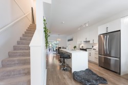 Modern 3 bed corner-unit townhouse built in 2023 and still under warranty! Bathed in natural light, the bright open-concept main floor features a stunning quartz-island kitchen, elegant modern light fixtures, and a spacious balcony perfect for summer BBQs. Quartz counters grace every bathroom, and the primary suite offers a luxurious walk-in closet with private ensuite. All bedrooms are generously sized and beautifully bright—perfect for a family-friendly lifestyle. Double garage plus an oversized parking pad provide ample space. Enjoy the large fenced backyard with a covered patio—ideal for entertaining or relaxing. Pets welcome. Just steps from vibrant historic Downtown Abbotsford’s charming restaurants, shops and cafes!