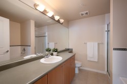 Rare find! Extra large 3br + 2.5bath, corner unit at Buchanan East. Conveniently located in the heart of Brentwood. Bright corner suite boasts 9ft high-ceiling throughout, large living room with gas fireplace, formal dining area and 2 spacious balconies with view of Northshore mountain. Kitchen comes with generous eating area, maple shaker cabinet, granite counter tops, S/S appliances. King-sized master bedroom can accommodate house-size furniture, and 2 good size bedrooms for family or guests. 2.5 bath + laundry room. 2 parking + 1 storage. 1 pet allowed (up to 50lb). Amenity include hot-tub & sauna, exercise room, and lounge. Plenty of visitor parking. Direct access to shopping, short walk to Brentwood mall, Skytrain, and easy access to HWY 1. OPEN HOUSE SEP 13th & 14th, 2-4pm.